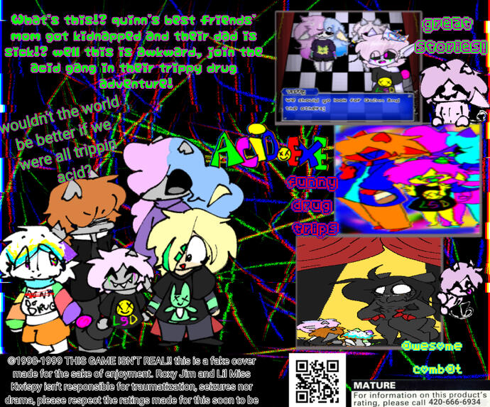 THIS IS A M RATED GAMEAcid.exe is a game about you having to save you best friend's mom from this weird fancy bri'ish lookin mf and his rat imps through the power of understanding and friendship!! take a journey where you over come fears from the late 90sme and kristy have been working on this since 2018, from a cringy deltarune au made off of a fanfic to use finally being original and having better characters, it really has been a long time!